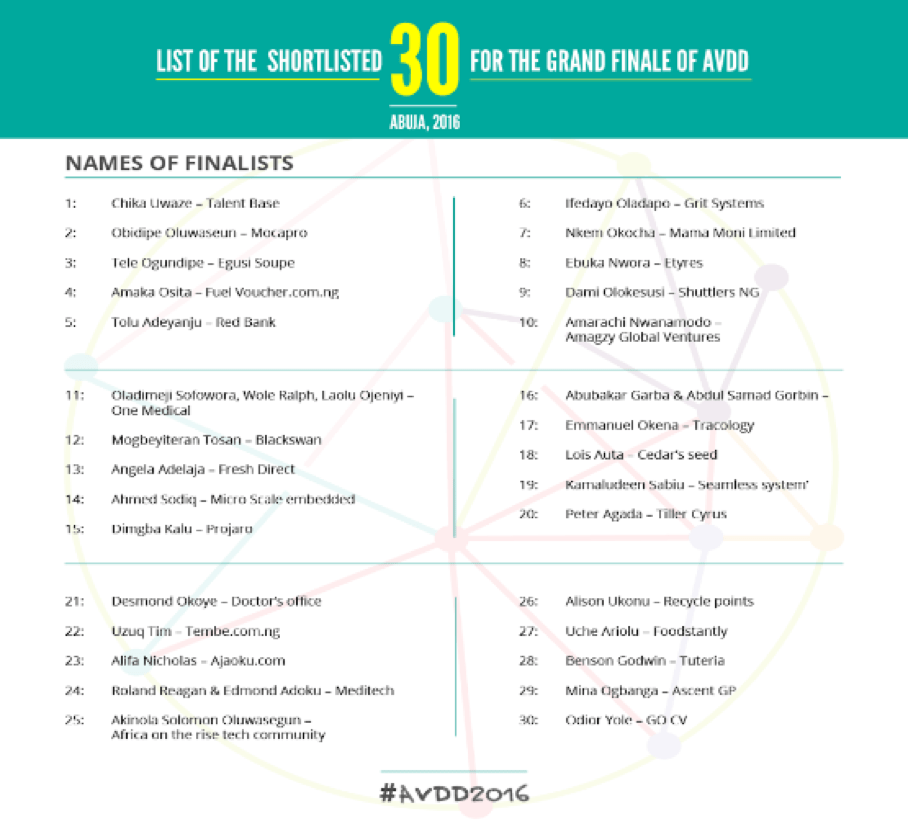 On the 4th of August, 2016, Senior Special Assistant to the Vice-President on Media, Laolu Akande, issued a press release ‘’THIRTY NIGERIANS PICKED TO PITCH INNOVATIVE TECH IDEAS AT ASO VILLA DEMO DAY, AVDDOutcome of the selection events in Abuja, Lagos and Port Harcourt’’ .