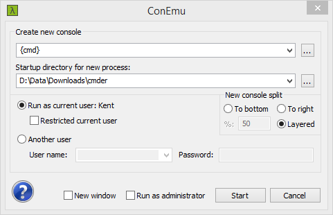 It’s easy to launch another console session in another tab without another new Window session crowding up your desktop. And you can launch it in different Startup directory, as another user or as administrator, in split mode or as in a new Window session.