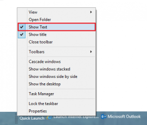 Step 3: On quick launch bar it will show you all the things on text form. If you want to show only icons then just Right-click on the dotted line, and just deselect Show Text.
