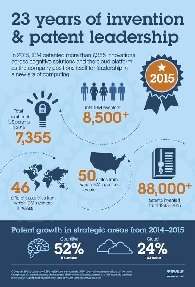 More than 8,500 IBM personnel residing in the U.S. and across 46 countries were responsible for IBM’s 2015 patent tally. IBM inventors who reside outside the U.S. contributed to more than 36% of the company’s 2015 patents.