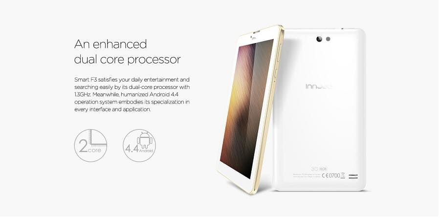 The InnJoo F3 is a dual SIM, 7-inch tablet with a 1024 x 600 pixels display and a pixel density of 169ppi. It weighs about 280g and measures 188.8 x 108.9 x 10.7 mm in dimensions