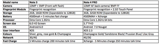 Below is the Comparism of  Infinix Note 3 and Infinix Note 4 PRO