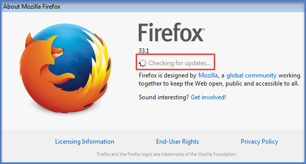 Update your Firefox: Go to Menu bar, click on Help –> About Firefox, the About Mozilla Firefox window will start checking and updating the programs.