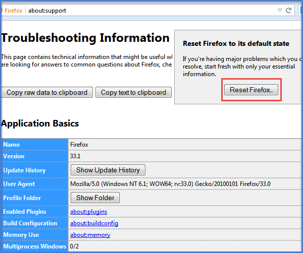 In the Troubleshooting Information window, click on the Reset Firefox button will create a new profile with the migration of all old data. This fresh and new profile will be surely helpful in fix your Firefox crashes.