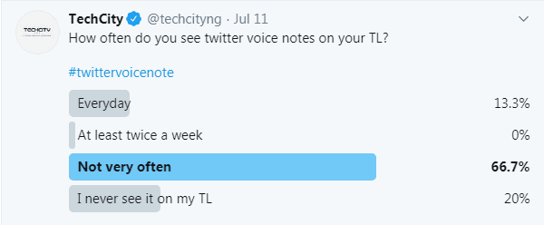 • It can also be deduced from these two results, what may be responsible for the infrequent voice notes on the timeline for 66.7% of respondents and a near quarter in Poll 4 who have never come across any on their timelines.