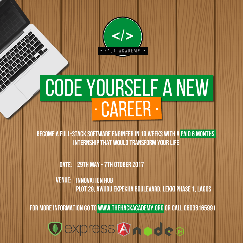 Hack Academy is set to begin a new programme from the 29th May 2017 to the 7th of October, 2017. This programme gives you the opportunity to become a full-stack Software Engineer in just 19 weeks and will enable you acquire the skills that would translate directly into getting tech jobs.